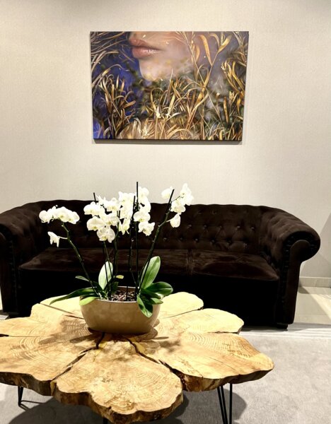 By juxtaposing female portraits with elements of nature, the artist experiences both her own transformational cycles and synchronizes with the world around her in a daily life. The painter would like the contact with her art to be as calming as contact with nature, and presented states of the inner side of female to become a mirror of self-reflection for the recipient.